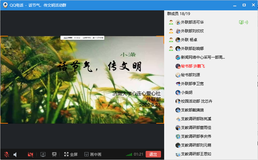 “夜莺啼绿柳,皓月醒长空。”5月20日,是二十四节气中的小满。为了让同学们了解更多的二十四节气知识,传承和发扬我国的传统文化,济南大学心连心爱心社在5月23日上午十点通过线上会议的形式举办了“话节气,传文明”活动,心连心爱心社的部分成员参加了此次活动。