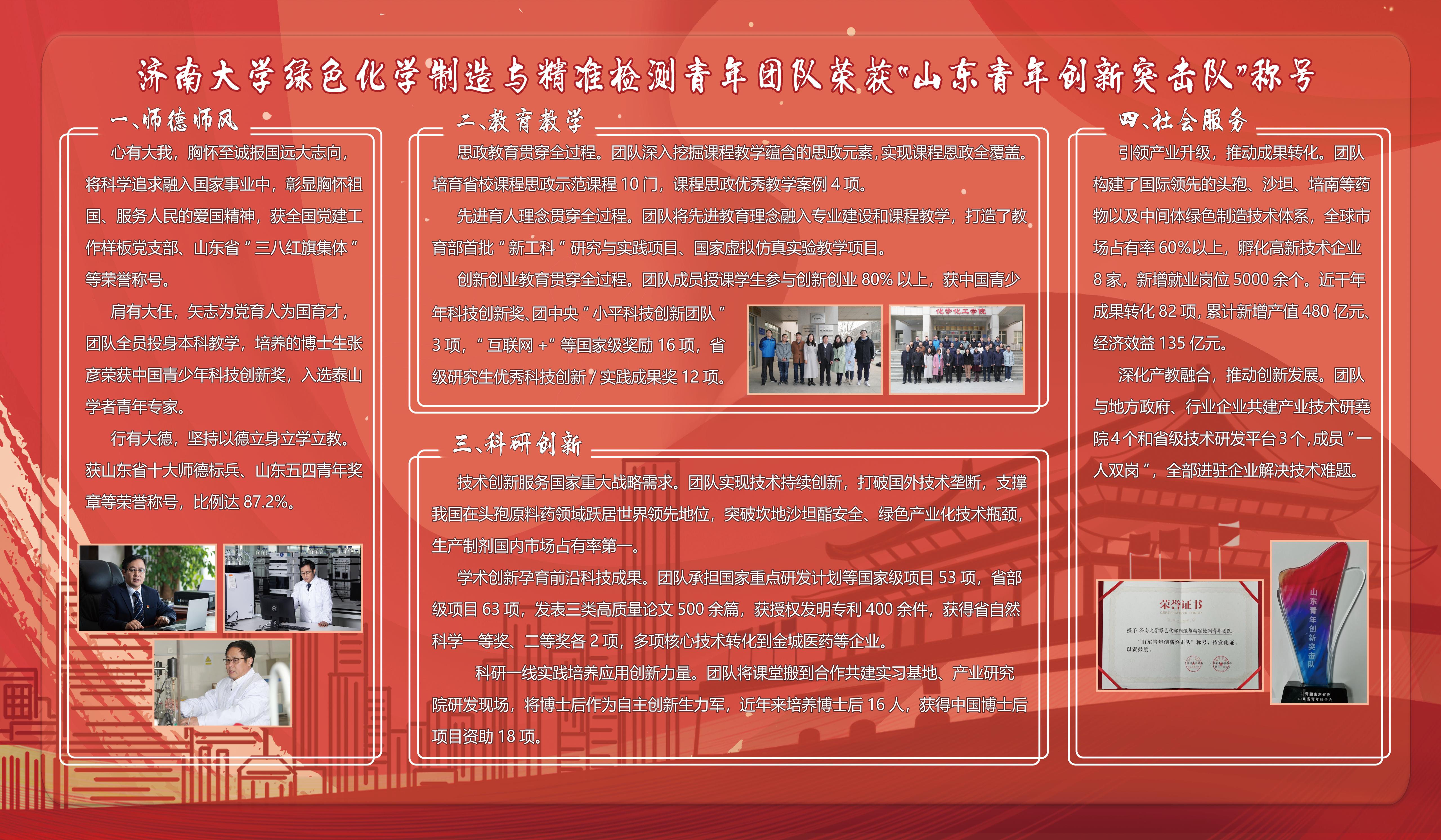 绿色化学制造与精准检测青年团队荣获“山东青年创新突击队”称号,同时在各个方面取得佳绩。