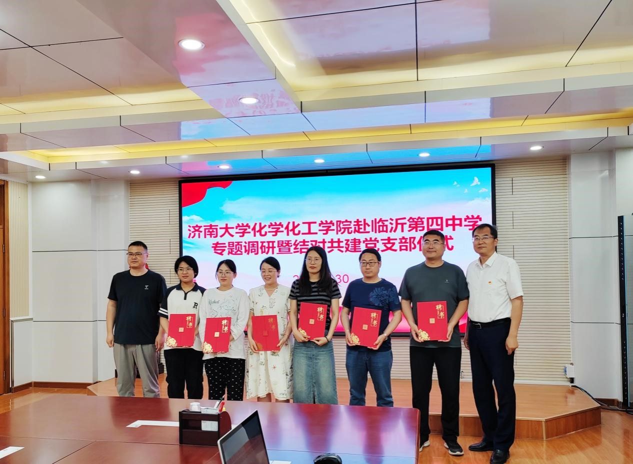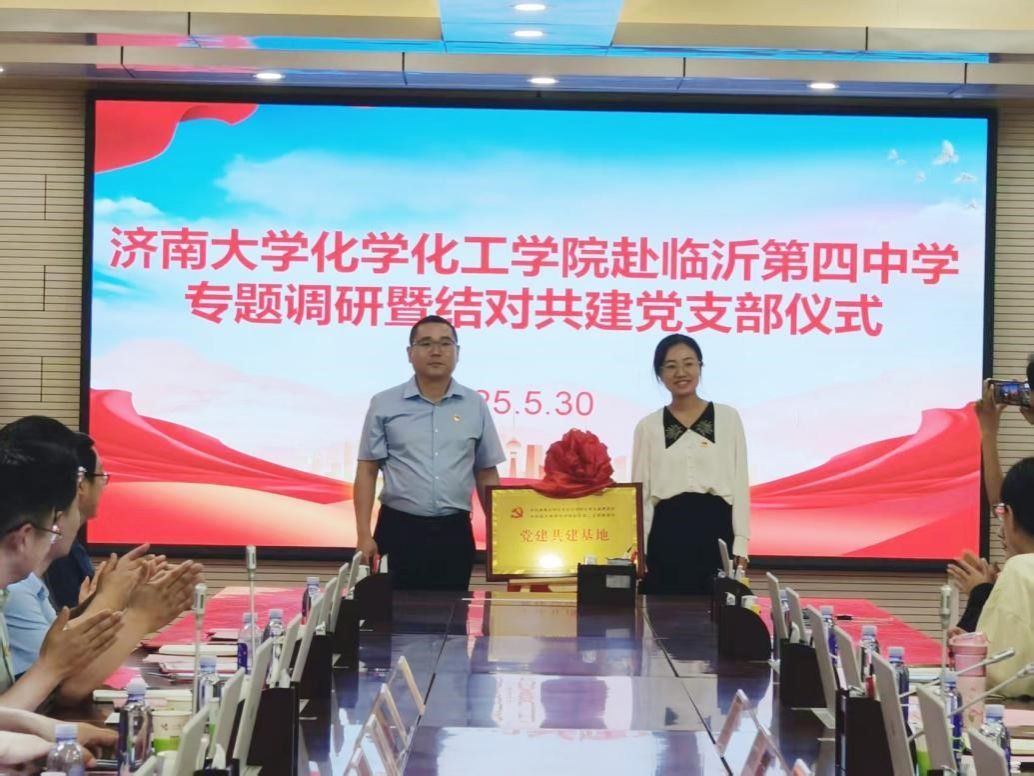 化学党支部书记杨红晓与临沂第四中学西校区第二支部书记王雷共同为“党建共建基地”揭牌。两位书记分别表示将以支部共建为契机,把党建工作与教育教学、人才培养等中心工作深度融合,实现“党建引领方向,业务彰显成效”的良性循环。