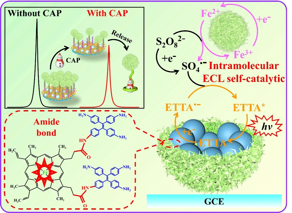 纳米限域策略是一种可解决分散状态下聚集诱导发光(AIE)材料的发光猝灭问题的有效方法。然而,传统的合成载体大多使用了过量的金属离子,这在生物安全性方面存在显著缺陷。作为一种天然的血液蛋白,血红蛋白(Hemo)具有优异的生物相容性和生物安全性。同时它还含有Fe2+,可用作电化学发光(ECL)过程的催化剂。因此,济南大学魏琴教授团队,魏琴、范大伟、冯锐作为通讯作者,提出了一种基于血红蛋白纳米限域四-(4-氨基苯)乙烯(ETTA)的新型自催化聚集诱导电子发光(AIECL)探针,它克服了传统合成载体的高细胞毒性。相关成果以“Nanoconfinement Synergistic Self-Catalytic Coenhanced Electrochemiluminescence Sensors for Chloramphenicol Detection”为题发表在分析化学领域国际顶级期刊《Analytical Chemistry》上。在这项工作中,血红蛋白被用作双功能纳米封装剂,具有纳米限域载体和共反应剂促进剂的双重作用。其独特的四元结构不仅为纳米限制提供了稳定的自组装环境,而且有效地抑制了ETTA在溶液中的自由扩散,从而诱导了ETTA的AIECL。重要的是,血红蛋白中的Fe2+可以作为自催化剂,缩短电子转移路径,大幅提高发光体的电化学发光性能。此外,珊瑚状的金结构也可以有效提高电极的导电性和负载能力。构建出的传感器可以实现桃花虾和白蛤样品中氯霉素的精准检测。这项工作为构建绿色高效的生物安全探针提供了新的见解,在食品安全检测领域显示出重要的应用潜力。