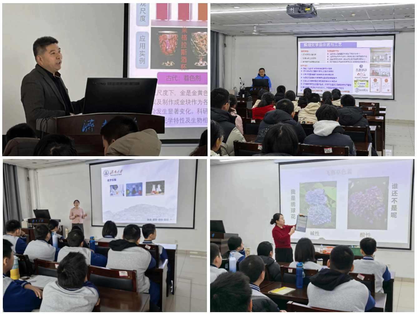 本次寒假系列科普教育社会实践活动以“科普讲座+实践体验+互动探究”为核心,全方位构建趣味化、立体化的科普教育场景。在化学前沿科普讲座环节,学院副院长李村成、副教授孙元玲等专家教授结合学院科研方向与学科建设成效、化学前沿科普作品、化学与人类健康等方面,以“衣、食、住、行”日常生活中的案例为主线,用通俗易懂的语言讲解化学学科的前沿进展与应用价值,将抽象的化学原理与日常生活、工业生产、医疗健康紧密结合,让同学们深刻认识到化学是推动社会进步的核心力量,点燃了大家探索科学未知的兴趣。