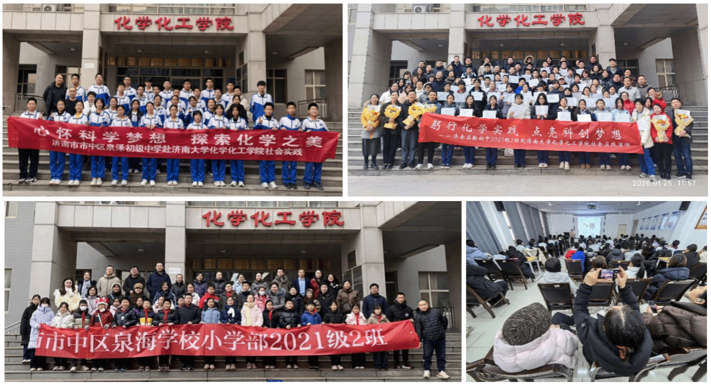 、山东省应用化学科普教育基地、山东省化学材料前沿科普工作室、山东省化学与健康科普工作室联合开展的“躬行化学实践,点亮科创梦想”等系列科普教育和社会实践活动在济南大学顺利举行。济南市实验初级中学、济南市市中区泉泽初级中学、济南市市中区泉海学校小学等学校300余名师生、家长走进高校实验室与科普基地,在沉浸式体验中感受化学魅力,播撒科创种子。