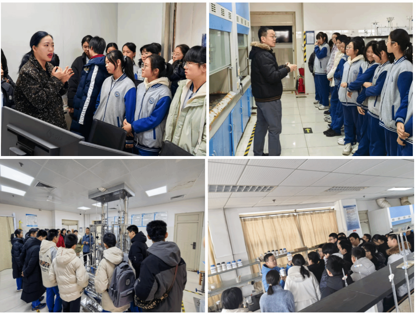 随后同学们有序走进科普长廊,通过图文展板、实物模型、仪器展示等形式,了解学院概况、发展历程以及近年来在氟化工新材料、精细化学品合成、绿色催化技术、化学测量与健康等方向取得的重要科研成果。最后,姜占坤副教授、张卫民副教授、张诺老师带领同学们依次来到化学化工实验室、大型仪器测试平台,给同学们详细讲解了各类实验装置的工作原理、化学材料的应用场景,从基础化学实验器材到高端科研仪器设备,从化工工艺到前沿纳米技术,同学们在直观感知中拓宽科学视野,感受化学学科的深厚底蕴与创新活力。
